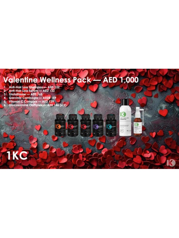 Real love starts with self-care. Our "Valentine Wellness Pack" is specially curated to boost your body's vitality and hair health. This comprehensive set combines external care with Anti-Hair Loss shampoo and serum, alongside internal support from Glucosamine (2 bottles) for joints, plus Glutathione and Vitamin C for energy and radiance. The ultimate gift for a healthy, vibrant lifestyle.